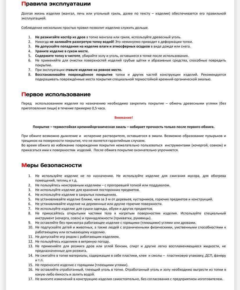 Купили этот мангал лет 6 назад. Обжигал по инструкции. Сразу после покупки позвонил производителю и задал вопрос, как такую красоту продают БЕЗ ЧЕХЛА? Ответ обрадовал, мангал всепогодный, окраска надежна, стоек к осадкам. А чехол не нужен, под ним мангал очень быстро сгниет. Как оказалось, все не так и с точностью наоборот. За эти несколько лет мангал полностью потерял внешний вид. Хорошо, что сохранил работоспособность.
